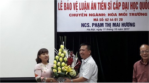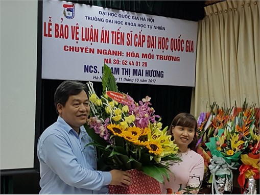 Tại buổi bảo vệ, đại diện cơ quan và cơ sở đào tạo Trường Đại học Khoa học Tự nhiên - ĐHQGHN, cùng bạn bè, đồng nghiệp đã tới chúc mừng và tặng hoa nghiên cứu sinh.